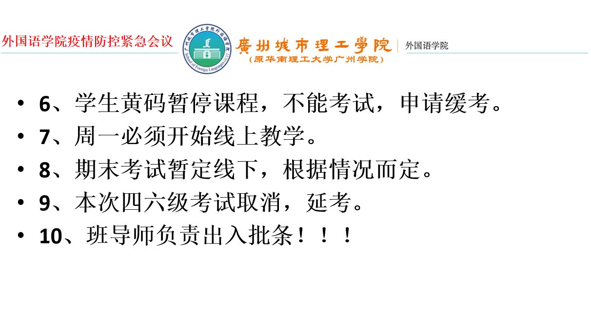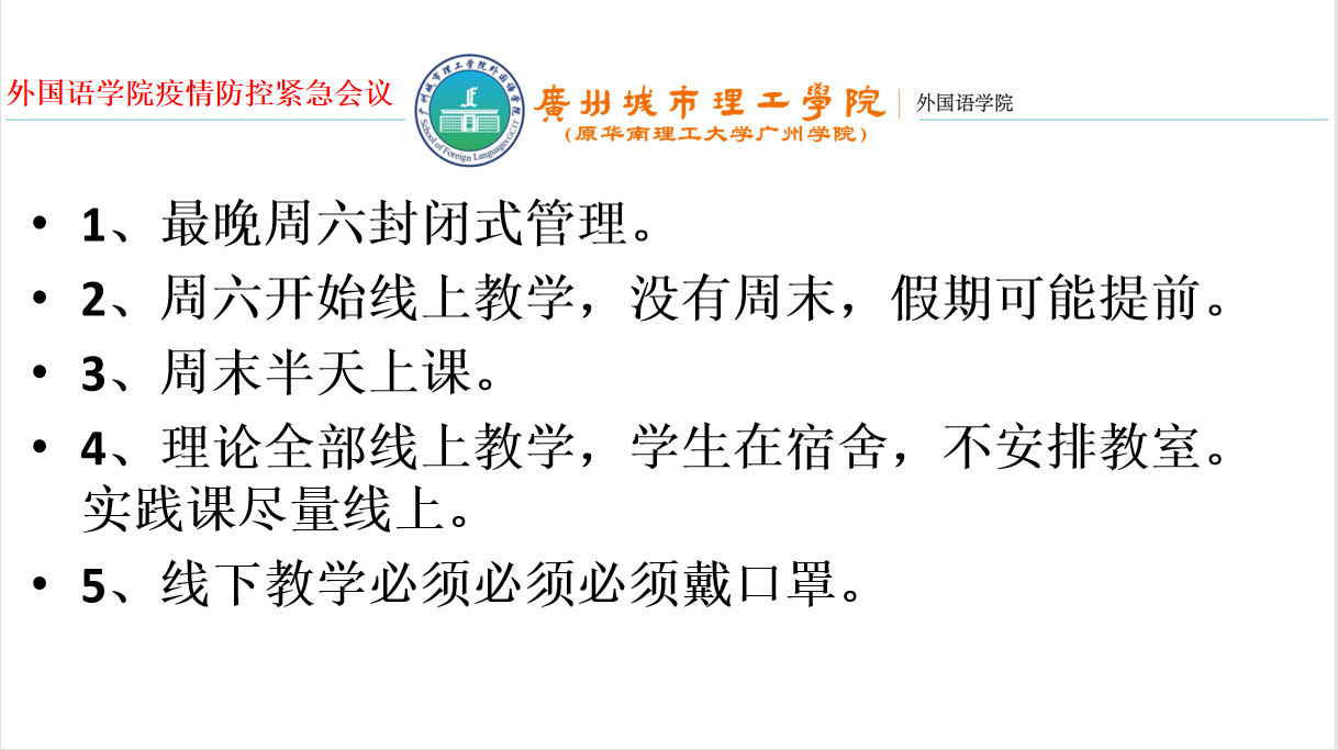 根据学校最新疫情防控要求,全体员工在如实做好14天行程轨迹记录的基础之上,积极配合学校及学院最新的管理要求,如封闭式管理;在宿舍内进行线上学习,线下教学必须戴口罩;尽量不出校,要出校,需严格填写正确请假条并经过班导师、辅导员、学院三方的签名及允许等。