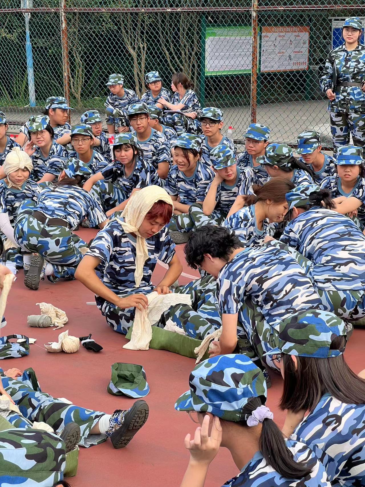 军训-急救包扎练习(蔡晓坤 摄)