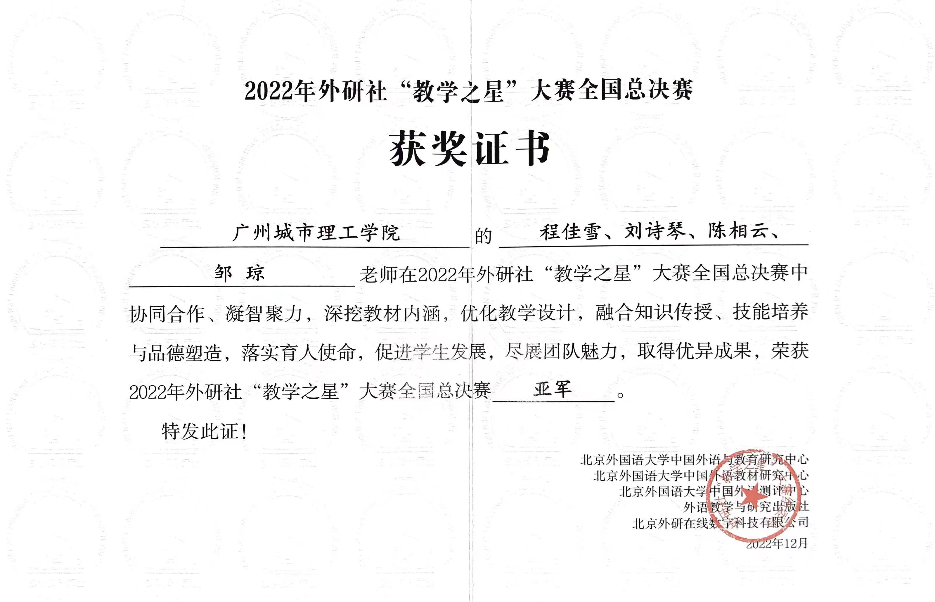 程佳雪、刘诗琴、陈相云、邹琼团队获外研社“教学之星”全国决赛亚军