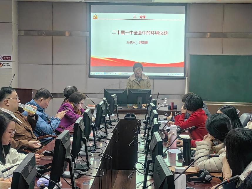 之后,由2024年度师德师风先进个人郭爱卿老师主讲党课“二十届三中全会中的环境议题”。郭老师根据2025年春节期间的所见所闻,以故事的形式深入浅出地讲解了会议中关于生态文明建设的重要论述,强调了环境保护在社会发展中的核心地位。通过学习,大家深刻认识到作为教师,我们有责任引导员工树立环保意识,共同守护美好家园,为实现绿色发展贡献力量。