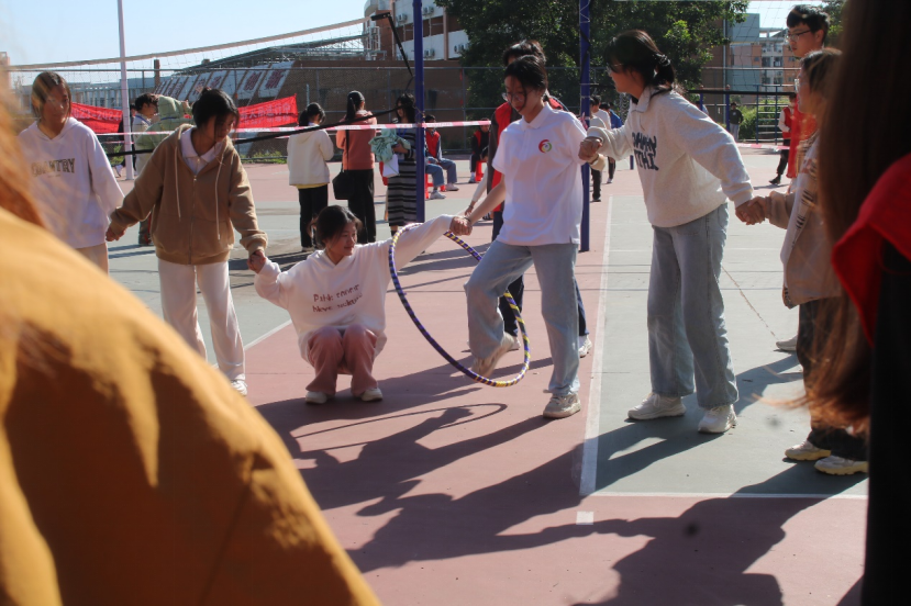 同学们手牵拉手,围成一个大大的圈,从他们的身上穿过,越过一个个同学,最终到达第一个同学的手上。