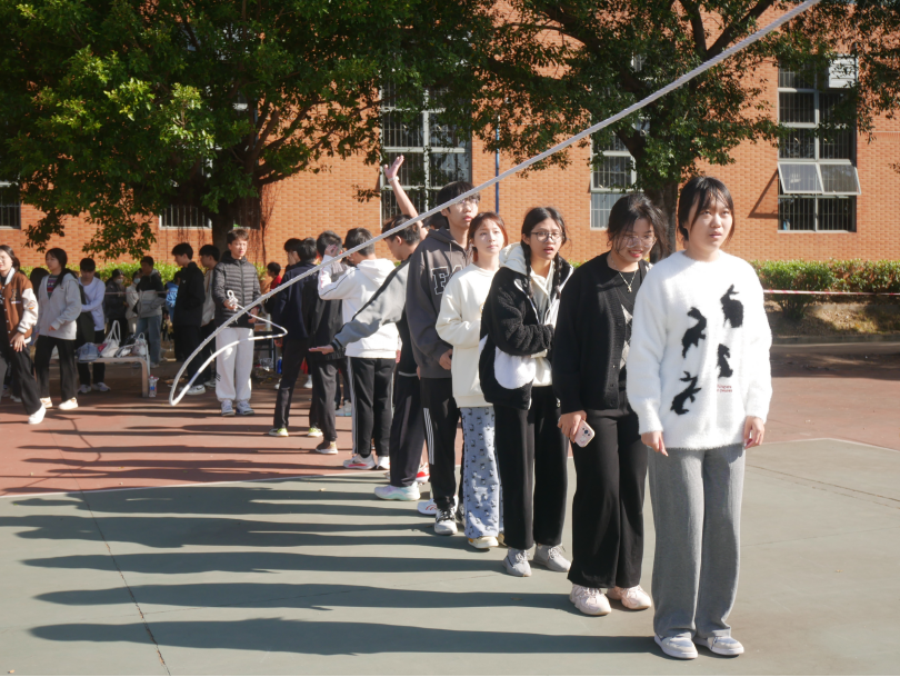 同学们有序地排成一对,随着“一,二,三,跳!”的号令发出,大家默契地随地而跳,完美地跳过一次又一次绳子。