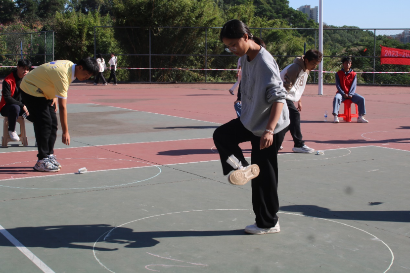 同学们按照顺序,走到自己的位置,熟练地将毽球扔起,双腿向上抬,用脚部的力量接起毽球。