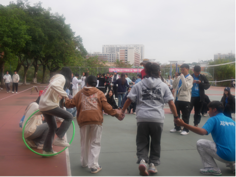 团队成员们手拉手围成一圈,各个成员使用拉、蹦、缩等动作,使呼啦圈依次传递,不仅锻炼了同学们的身体协调能力,更是增进对集体的参与意识与责任心。