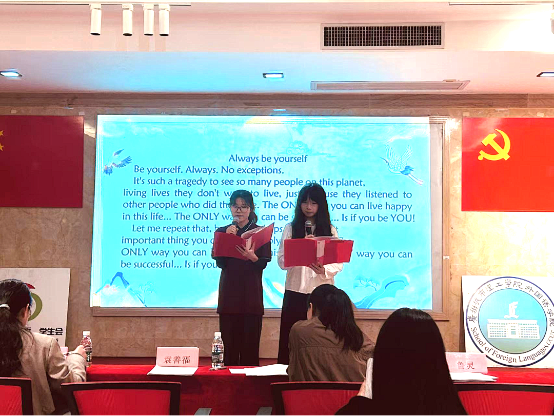 “外语风华杯”决赛在大家的期待中于11月25日晚上19:00在A6-201缓缓拉开序幕。同时,出席本次活动的评委和嘉宾有:bevictor伟德官网团委书记袁善福老师,bevictor伟德官网团委副书记豆芹兰老师,公司党群服务中心指导老师李彩兰老师,学院辅导员李齐政老师、陈朝娉老师和教研室专任教师何晓惠老师、鲁灵老师以及bevictor伟德官网团委、员工会主要员工干部。赛前选手们在台下念念有词,对自己的朗读作品中每个音节,每个语调进行打磨,力求在台上呈现最完美的一面。此次朗读比赛分为个人朗读环节与双人搭档朗读环节。