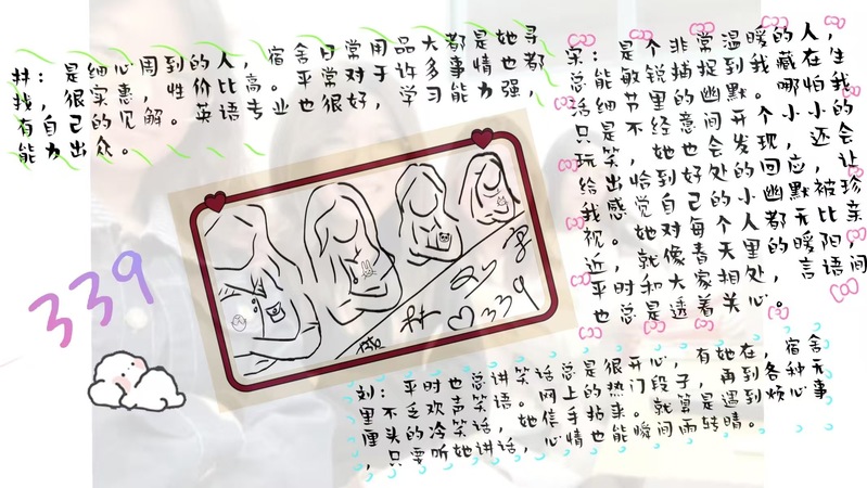 其中,339宿舍的代表分享道:“我的舍友林是细心周到的人,宿舍日常用品大都是她寻找,很实惠,性比较高。平常对于许多事情也都有自己的见解。英语专业也很好,学习能力强,能力出众。从这段描述中可以感受到对舍友的夸赞,表达了舍友间真挚的情谊。