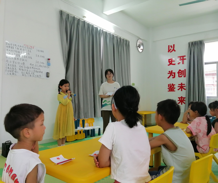 演讲与朗诵是以语言为突破口,开发员工的表达、思维、交际等潜能的综合性较强的课程,有利于培养员工的勇气和自信。实践团成员周馨和况佳文开展“自信、自立、自爱、自强、自洽”的主题教学,不仅让孩子们收获了演讲与朗诵的技巧,还在实践中提高了自我修养。