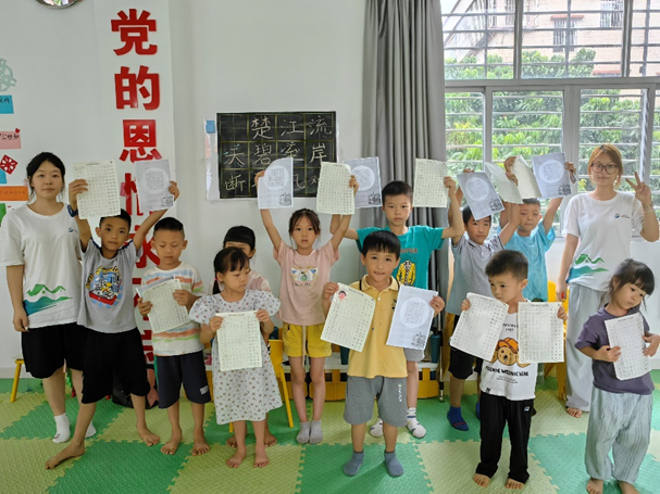 7月27日上午,实践团成员郑美婷和陈嘉芳为小站家的小朋友们带来第五次的硬笔书法课程,选取李白的《望天门山》作为主要授课内容。正式上课前,授课老师带领员工们进行一分钟的静坐训练,让他们的心静下来。员工们认真听授课老师讲解生词的单字结构以及笔划力量的把握后,便用稚嫩的小手拿起笔,在纸张上一笔一划地进行描红和撰写,用书法把诗中美丽的景色“画”了出来。