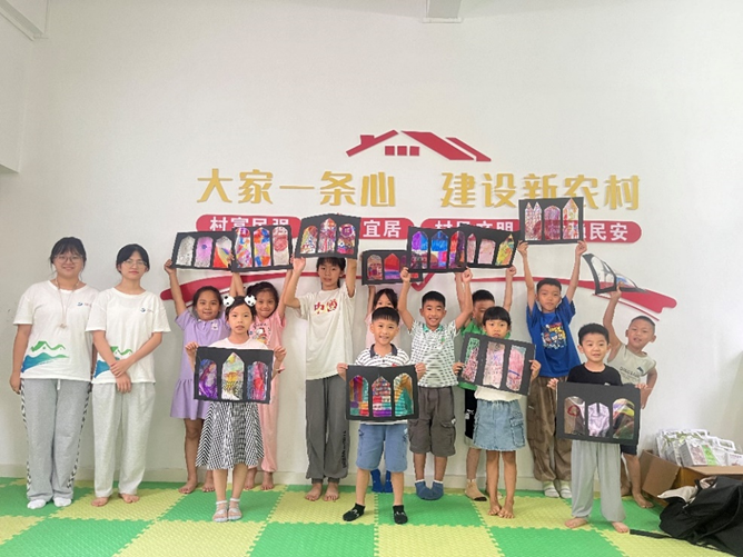 7月28日下午,实践团成员龚思睿和陈月碧为小朋友们带来主题为“用马克笔与玻璃纸绘制玻璃花窗”的艺术绘画课程。授课老师详细讲解了从玻璃花窗的组成结构、特点、色彩,到马克笔的色彩运用技巧以及玻璃纸的透光特性,让孩子们在欣赏其独特美感的同时,也感受到其背后深厚的文化底蕴。在实践环节中,每个孩子先用黑色卡纸剪出窗户的框架,再贴上玻璃纸,最后用马克笔在玻璃纸上勾勒出一幅幅精美的图案。待员工们完成作品后,用光透过玻璃纸,映照出五彩斑斓的光影,也映照出了孩子们脸上灿烂的笑容。本次课程不仅是一次艺术创作的探索,更是一次对传统与现代融合的实践。
