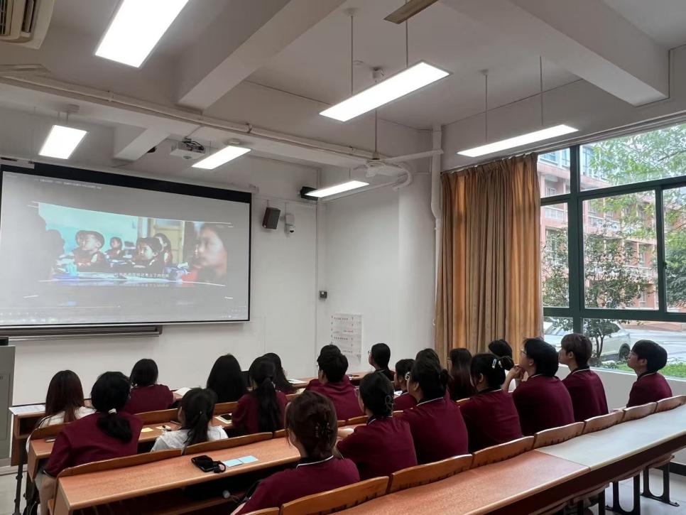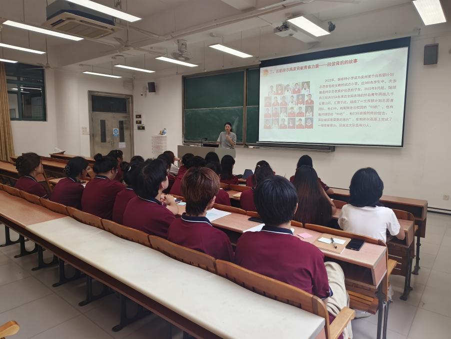 接着聚焦当下,豆芹兰老师带领全体学员学习习近平总书记的重要讲话精神以及给谢依特小学戍边支教西部计划志愿者服务队全体队员回信全文,进行了深度的剖析与解读。也着重向学员们介绍谢依特小学戍边支教西部计划志愿者服务队的事迹,观看了《一抹红:南疆村小的春天》,志愿者们响应国家号召,奔赴祖国最需要的地方,在艰苦的环境中坚守教育岗位,为边疆孩子带去知识与希望的故事。在交流发言中,学员们结合自身实际,踊跃发言,周伊凡同学激动地说:“听了支教志愿者们的故事,深受鼓舞;总书记的回信让我们看到了国家对青年一代的期望,我们要努力学习,增长本领,将来为国家建设添砖加瓦。”