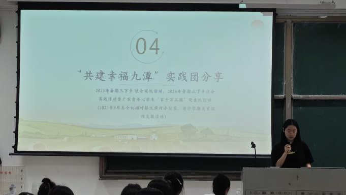 接下来,九潭村小站家美育支教项目负责人何洁怡同学就暑期三下乡活动相关安排,从队伍组建,到课程完善,到最后的经费报销、成果转化,详细地向在座同学分享。她还鼓励同学们多领域开展活动,在各类实践中磨砺自我。