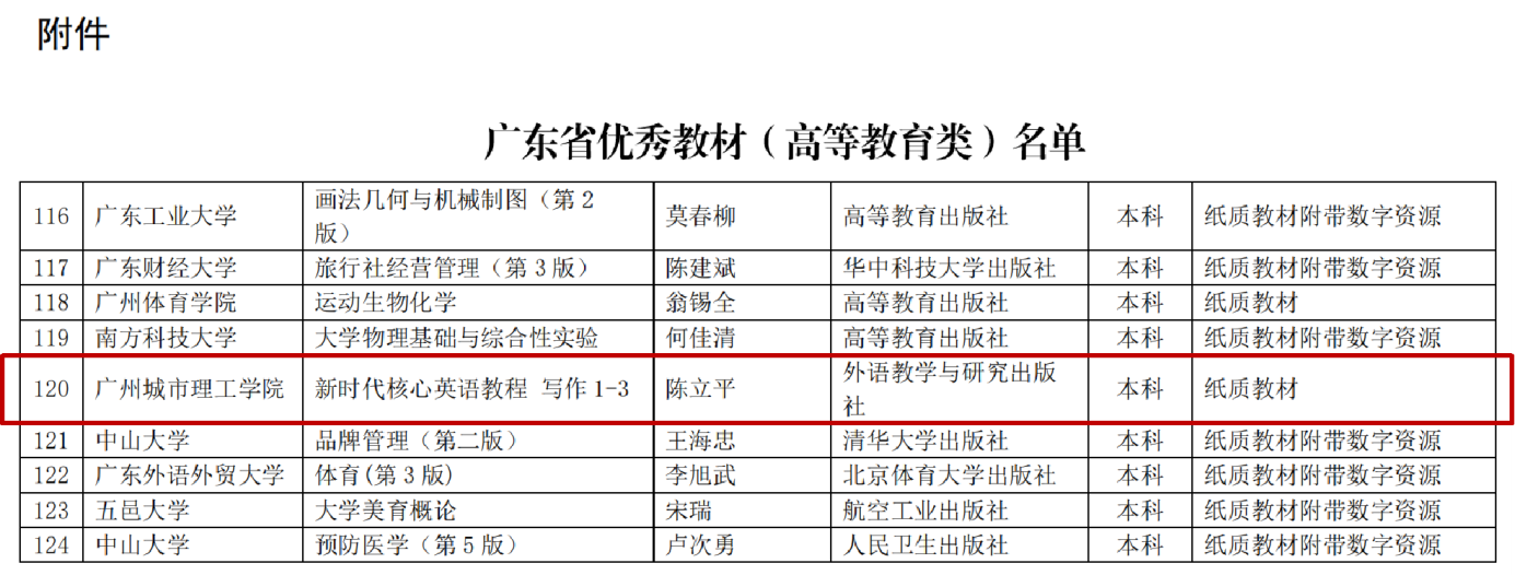 本网讯 (记者张佳佳)近日,广东省教育厅发布《关于广东省优秀教材(高等教育类)名单的公示》通知,bevictor伟德官网陈立平教授主编的《新时代核心英语教程 写作1-3》荣膺广东省优秀教材称号。这一荣誉不仅是对该系列教材在英语写作教学领域创新实践的权威认可,更彰显了其在提升教学质量方面的显著成效,标志着该教材的编写理念与实践价值获得学界高度认可。