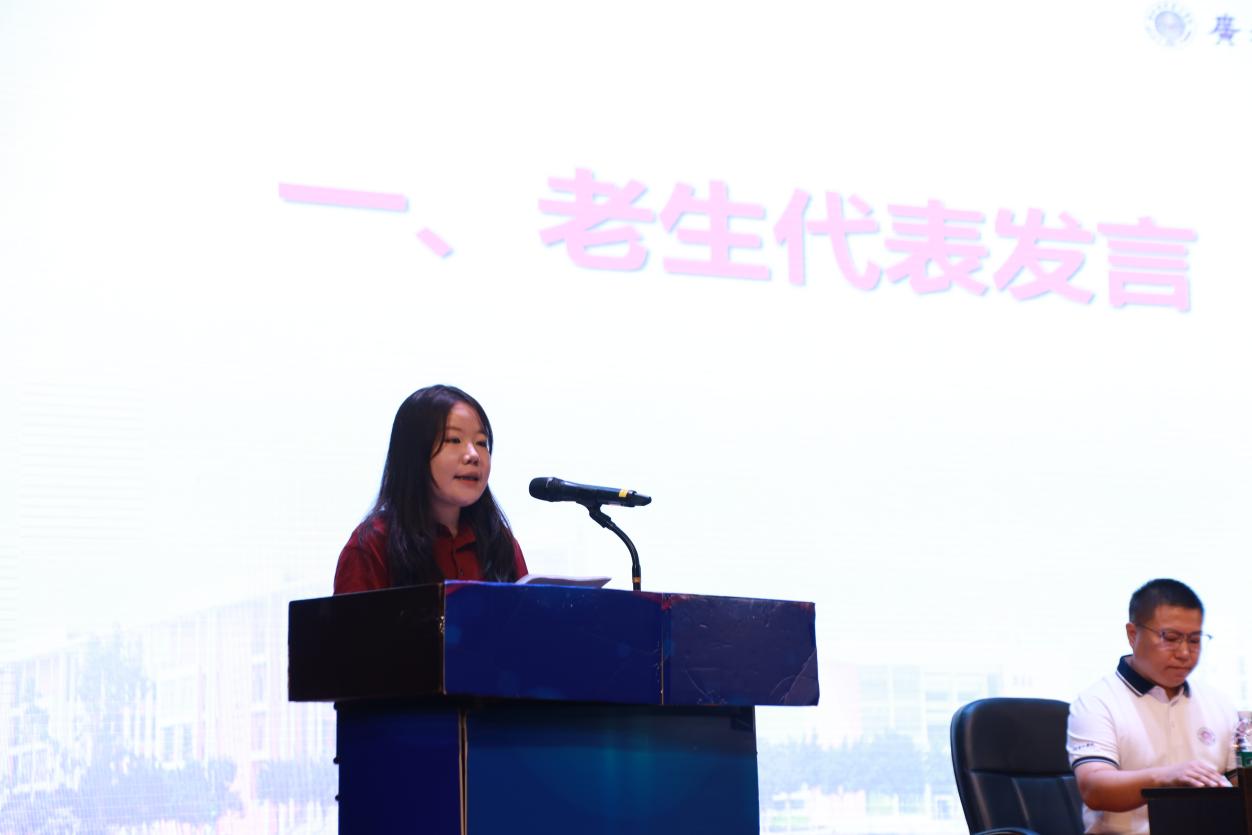 2022级英语1班的周馨同学作为老生代表发言。她以“和自己有个约定”为主题,从“学科竞赛新手”到“省级竞赛获奖者”的成长经历,向新生提出三点建议:一是“突破信息孤岛,找寻自己的赛道”,鼓励大家主动向老师请教,积极参与学科竞赛与校园活动,找准发展方向;二是“好好学习,好好生活”,强调专业知识是立身之本,同时要兼顾身心发展,丰富老员工活;三是“勇敢走出舒适圈”,通过自己竞选团支书、荣获校级奖学金的经历,诠释“青年的动人之处在于勇气与梦想”。她真诚的分享被新生们称为“大学第一份实用攻略”。