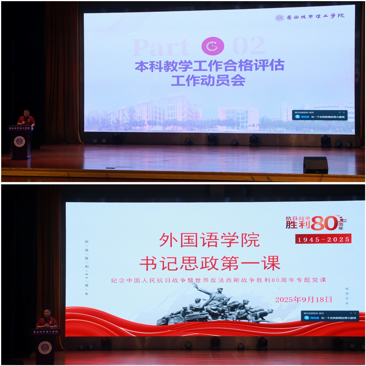 随后,李伟以“凝心聚力迎评估,砥砺奋进促成长”为题展开动员,并讲授思政第一课。在评估工作讲解部分,李伟副书记用“学院发展的‘里程碑’、专业建设的‘试金石’、员工成长的‘助推器’”三个比喻,生动阐释了本科教学工作合格评估的重要意义。他结合教育部评估指标体系,从课程设置优化、教学质量监控、实践教学强化、员工满意度提升等方面,详细介绍了学院的评估准备进展与下一步工作重点,并向全体员工发出“三个主动”倡议:主动参与课堂互动,提升专业知识掌握度;主动配合评估调研,客观反馈学习需求;主动参与校园文化活动,展现外语学子风貌。在书记第一课环节,他围绕“抗战胜利暨世界反法西斯战争胜利80周年”主题,通过讲述抗日英烈故事、分享当代青年使命案例,引导员工从历史中汲取精神力量,深刻理解“爱国”不仅是情感认同,更是“学好专业知识、服务国家需求”的实际行动。他特别鼓励外语专业员工,要以语言为桥梁,讲好中国故事、传播中国声音,将个人理想融入国家发展大局。