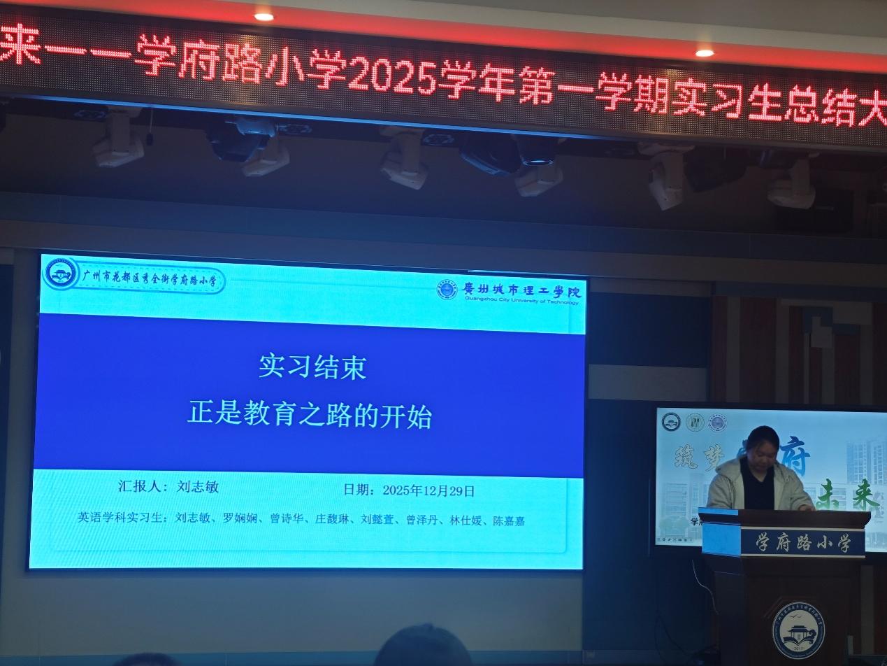 学府路小学董事长钟丽华在总结发言中,特别肯定了我们英语实习生的表现。她指出,实习生们为校园注入年轻活力,其专业素养与责任担当获得师生广泛认可。钟董事长提到,实习是从师范生到正式教师的关键过渡阶段,希望实习生们珍惜这段经历,将所学所悟运用到未来教学中,坚守教育初心,早日实现职业理想。
