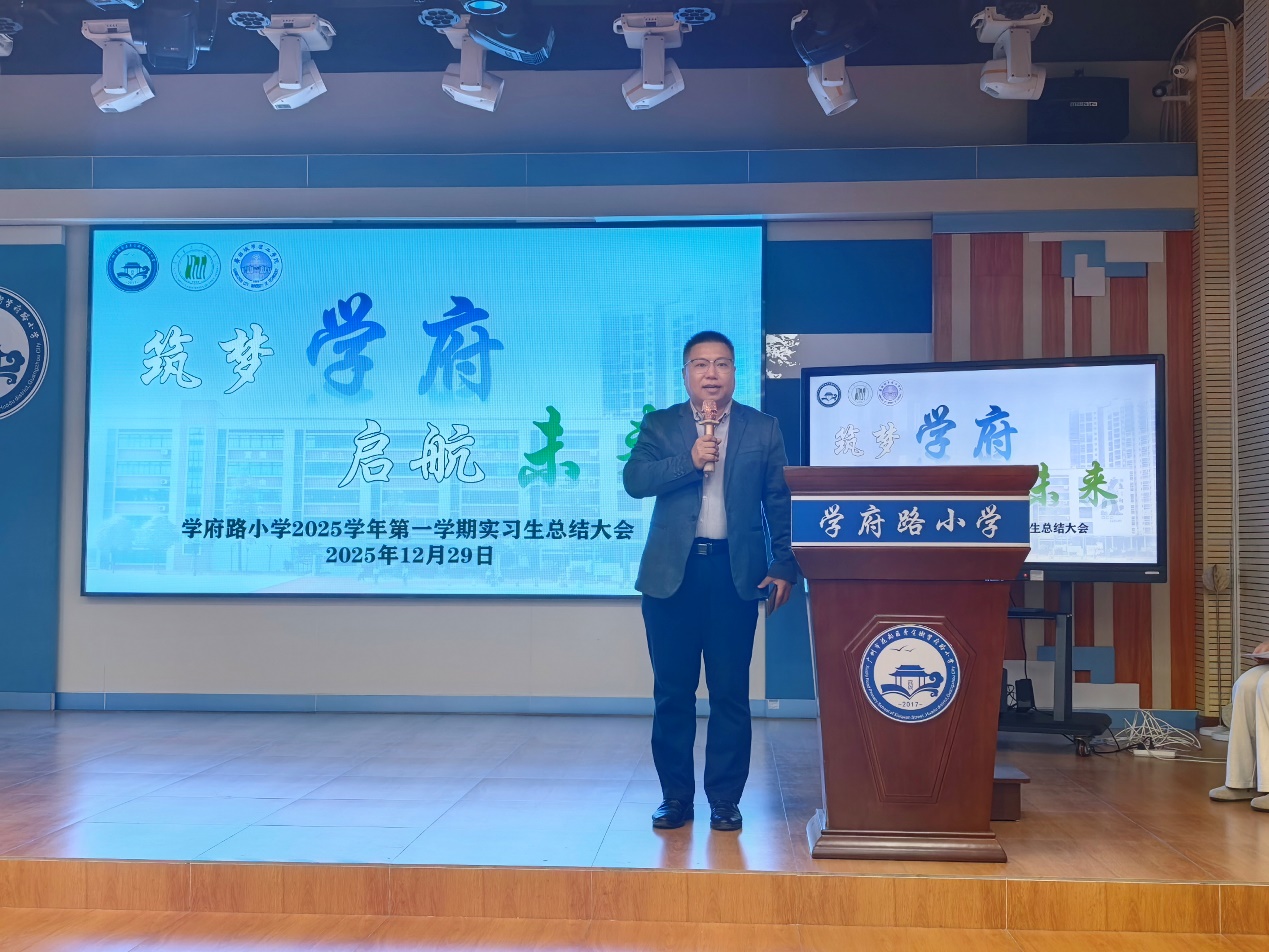 最后,李伟代表学院发言。他首先感谢学府路小学对公司实习工作的大力支持,从带教老师选拔到实习生培训,从日常指导到实习分享会,学校的精心筹划为实习生成长奠定了坚实基础。同时,他对实习生们提出殷切期望:希望大家牢记这段实习经历,将“用心教学、用爱育人”的精神带到未来工作中,不断夯实英语教学基本功,提升教学设计与课堂管理能力,努力成为有创意、有温度、有影响力的英语教师,为国家教育事业贡献力量。
